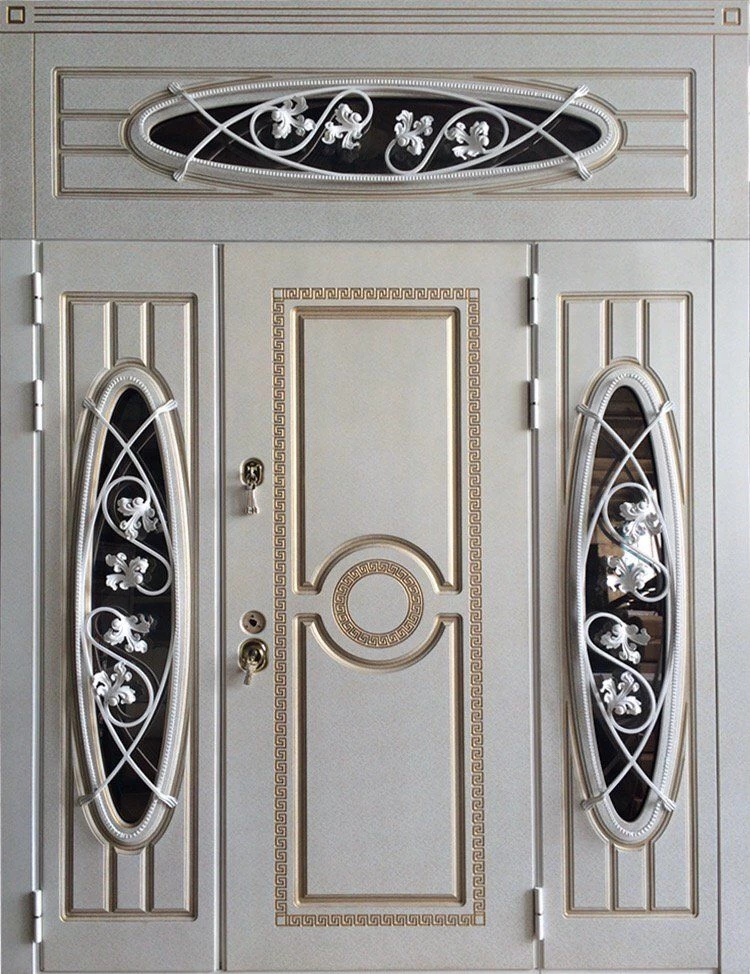 Металлическую дверь из корабельной фанеры можно декорировать ковкой и стеклом, витражом, зеркальными вставками. При установки такой двери в коттедж, стоит рассмотреть вариант изготовления двери с терморазрывом. Это позволит не делать в доме холодный тамбур, но при этом сохранить в доме тепло.