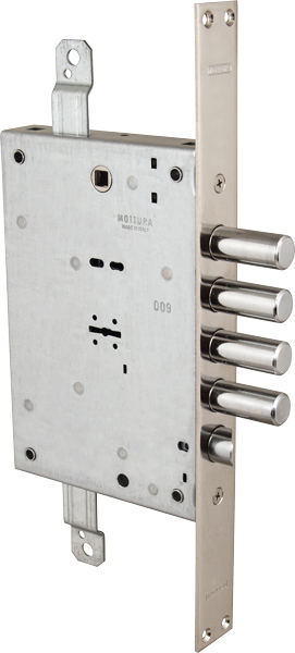 Замок врезной , с тремя точками запирания и защёлкой диаметром 20мм, приводимой в действие ключом и фалевой ручкой сечением квадрата 8мм. Удаление ключевого отверстия и ручки 60мм. Круглые ригеля диаметром 18мм. Ход тяг 19мм.